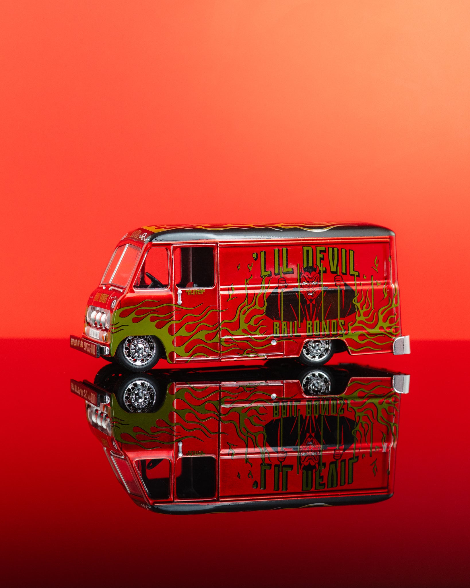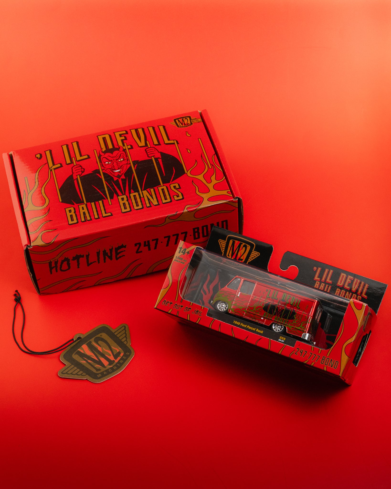 This release introduces a brand-new casting, the 1948 Ford Parcel Truck, finished in a bold Lil Devil Bail Bonds theme and paired with an exclusive air freshener. Produced in limited quantities and built for collectors who like their releases a little unhinged.